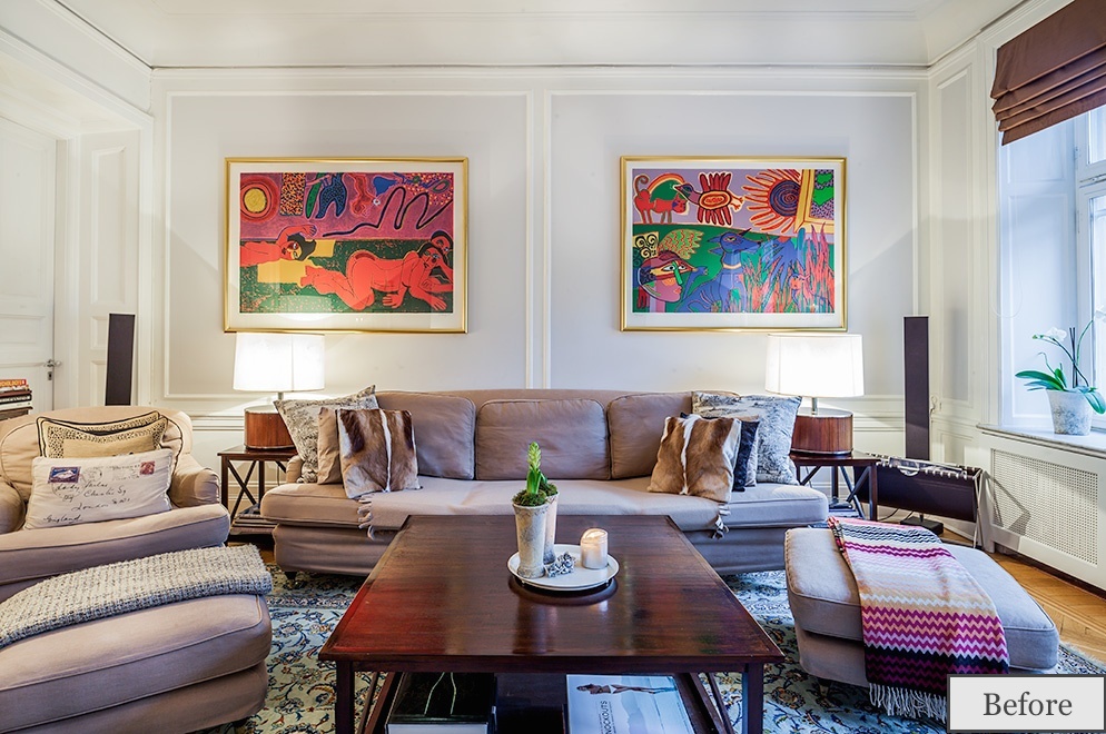 When I entered this charming living area I noticed the height and the big windows, which lightens up the room. I really wanted to soften up this room and create more space but also wealth at the same time.