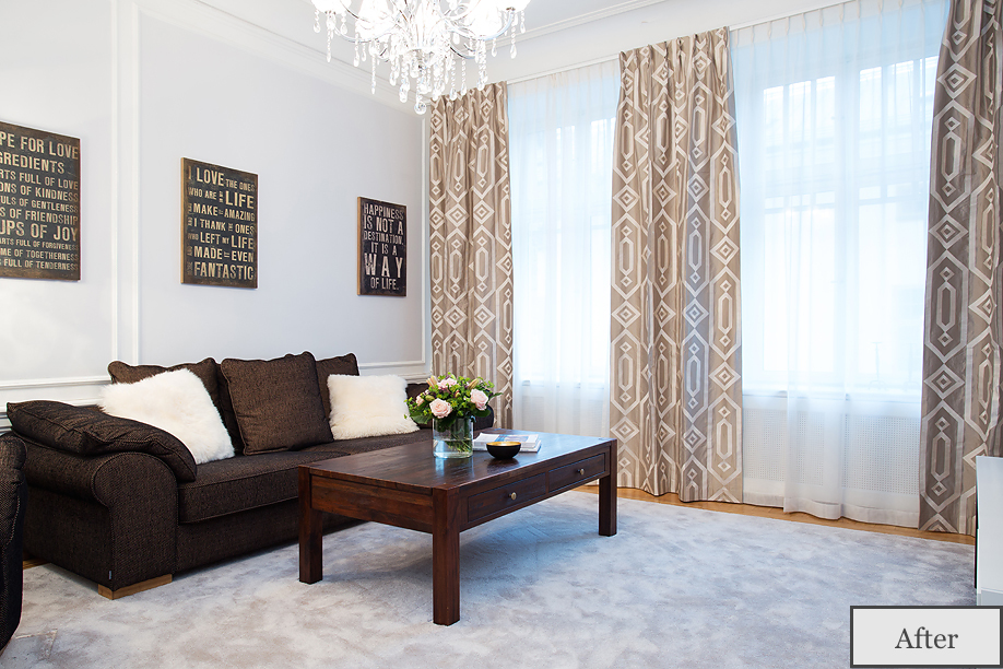 I added a huge exclusive and carefully chosen carpet to make the room feel bigger than it previously felt. I also avoided unnecessary items. By choosing a luxurious chandler I expanded the feeling of height. But certainly not least choosing fabrics for the curtains, here I used fabric from Larsen. I altered the height and widths of the rods, which led to a longer and wider downfall of the curtains. This expands the feeling of height and width of the room, which makes it look much more luxury and airy.